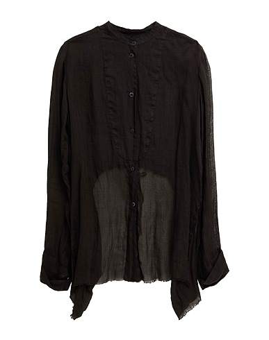 shirt, woven, solid color, open back, mandarin collar, long sleeves, buttoned cuffs, button fastenings, side splits, hand wash or dry clean, do not bleach, do not tumble dry, this brand runs small