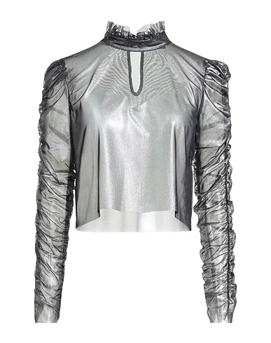 crop top, tulle, metallic, stretchy fabric, solid color, gathered, turtleneck, long sleeves, 1 button, raw-cut hem, machine wash or dry clean, do not bleach