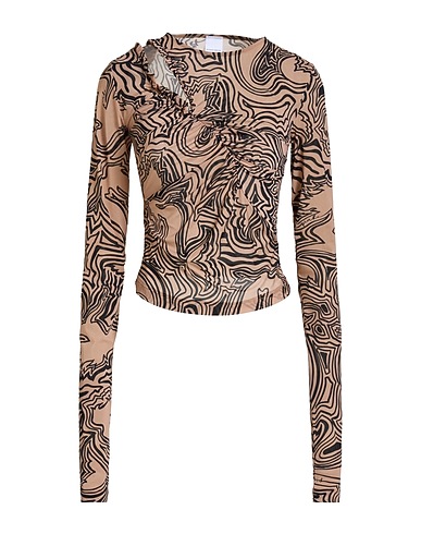 top, jersey, stretchy fabric, two-tone, gathered, cutout, brand logo, crewneck, long sleeves, machine wash or dry clean, do not bleach, do not tumble dry