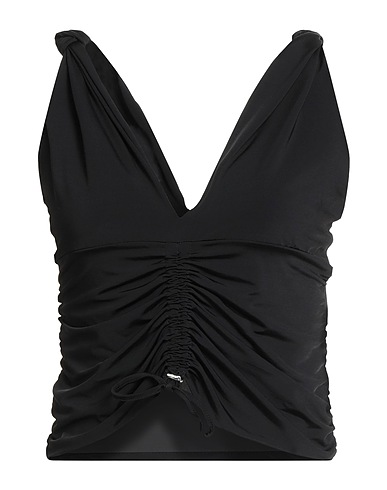 crop top, synthetic jersey, stretchy fabric, solid color, gathered, v-neck, sleeveless, fully lined, machine wash or dry clean, do not bleach, do not tumble dry