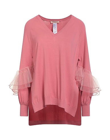 knitted, lightweight knit, brand logo, tulle trims, solid color, v-neck, long sleeves, side splits, hand wash, do not bleach, do not tumble dry
