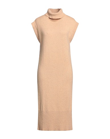 knitted, lightweight knit, brand logo, solid color, turtleneck, short sleeves, unlined, no pockets, side slit hemline, dress