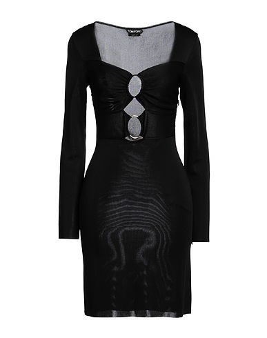 knitted, lightweight knit, embellished, solid color, deep neckline, long sleeves, unlined, without pockets, dry clean, do not bleach, do not tumble dry, bodycon dress