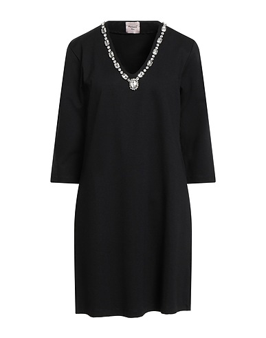 flared dress, jersey, stretchy fabric, solid color with appliqués, crystals, v-neck, 3/4 length sleeves, unlined, without pockets, hand wash or dry clean, do not bleach, do not tumble dry