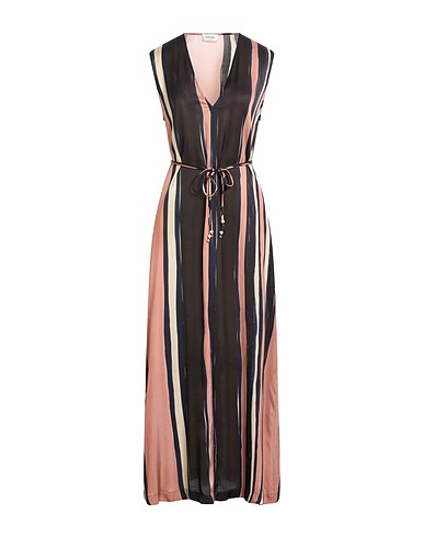 flared dress, satin, striped, no appliqués, v-neck, sleeveless, unlined, belted waistline, side splits, machine wash or dry clean, do not bleach, do not tumble dry