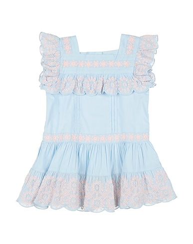 woven, solid color with appliqués, embroidered, ruffles, gathered, square neckline, short sleeves, fully lined, button fastenings, slit pockets, machine wash, do not bleach, do not tumble dry