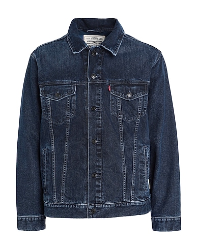 denim trucker jacket, denim, faded, solid color, brand logo, dark wash, classic collar, single-breasted , long sleeves, buttoned cuffs, fully lined, button fastenings, multipockets