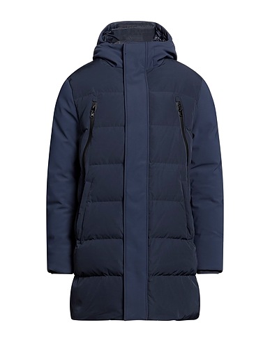 down coat, shell, quilted, solid color, no appliqués, hooded, long sleeves, goose down interior, heavyweight padding, zipper fastening, snap fastenings, zipped pockets, contains non-textile parts of animal origin