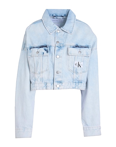 denim trucker jacket, denim, faded, solid color with appliqués, brand logo, light wash, classic collar, single-breasted , long sleeves, buttoned cuffs, unlined, button fastenings, two chest pockets