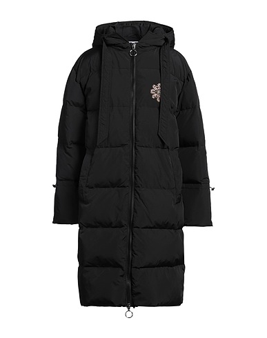 down coat, shell, solid color with print, brand logo, hooded, long sleeves, duck down filling, zipper fastening, multipockets, contains non-textile parts of animal origin, machine wash, do not bleach, tumble dry