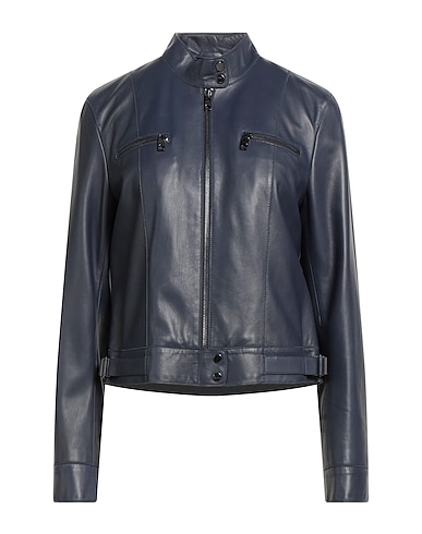 biker jacket, leather, strap detailing, solid color, mandarin collar, single-breasted , long sleeves, fully lined, zipper fastening, snap fastenings, two chest pockets, contains non-textile parts of animal origin, dry clean, do not bleach, do not tumble dry