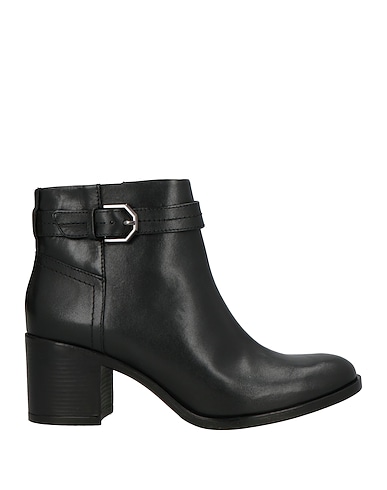 ankle boots, leather, solid color with appliqués, buckle, fully lined, zipper fastening, round toe, square heel, rubber cleated sole, contains non-textile parts of animal origin