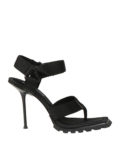 thong sandals, woven, solid color, brand logo, buckle-fastening ankle strap, square toe, spike heel, rubber cleated sole, fully lined