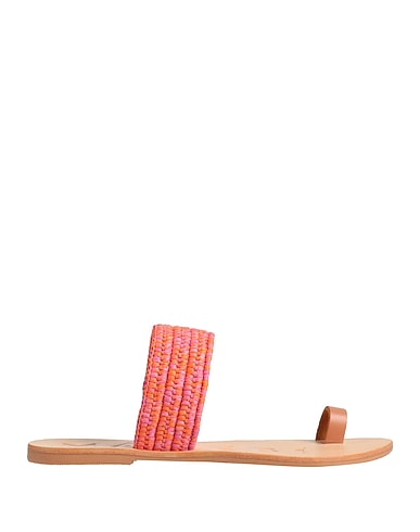 toe strap sandals, leather, raffia, two-tone, no appliqués, leather lining, round toe, flat, rubber sole, contains non-textile parts of animal origin