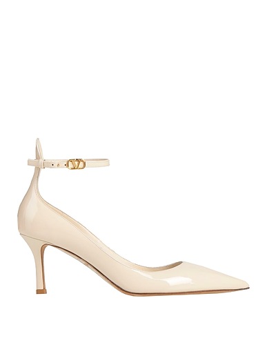 pumps, patent leather, solid color, logo-embellished, buckle-fastening ankle strap, pointed toe, covered heel, leather lining, leather sole, contains non-textile parts of animal origin