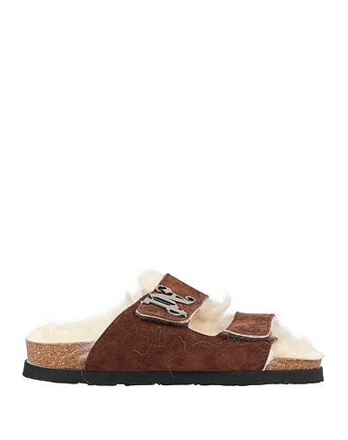 technical sandals, suede, solid color with appliqués, brand logo, lined in shearling, velcro fastening, round toe, flat, rubber cleated sole, contains non-textile parts of animal origin