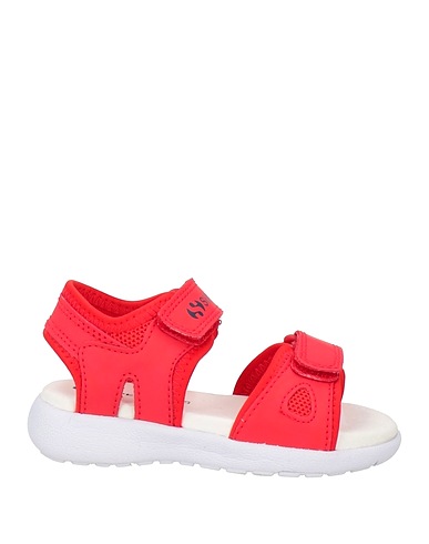 coated fabric, brand logo, solid color, fabric inner, velcro fastening, round toe, flat, rubber sole, lifestyle, open sandals
