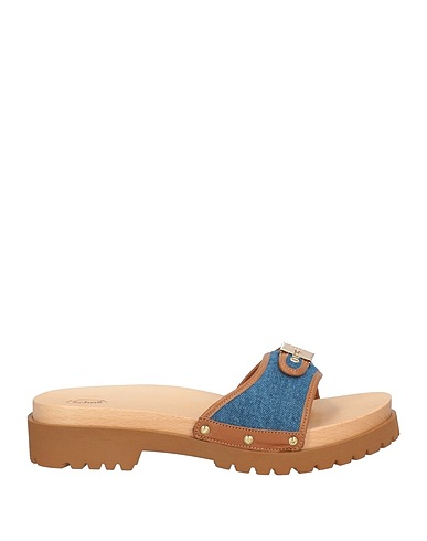 slide sandals, denim, leather, two-tone, brand logo, buckle fastening, round toe, block heel, rubber cleated sole, leather lining, contains non-textile parts of animal origin