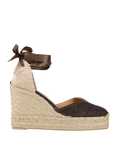 espadrille sandals, canvas, metallic, two-tone, no appliqués, ties at ankle, round toe, wedge, rubber sole, unlined