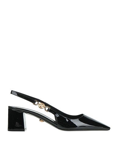 slingback pumps, patent leather, brand logo, solid color, leather lining, elasticized strap, pointed toe, square heel, covered heel, leather sole, contains non-textile parts of animal origin