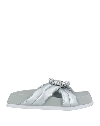 sandals, coated fabric, metallic, crystals, solid color with appliqués, fabric inner, square toe, flat, rubber sole