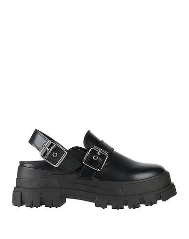 mules, coated fabric, brand logo, solid color, fully lined, buckle fastening, round toe, flat, lug sole