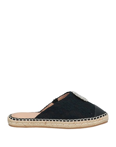 espadrille sandals, lace, synthetic material, solid color with appliqués, crystals, brand logo, round toe, flat, rubber cleated sole, rubber lining