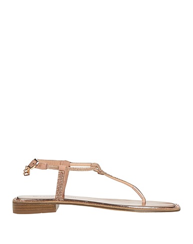 ankle strap thong sandals, brushed synthetic material, solid color with appliqués, crystals, brand logo, rubber lining, buckle-fastening ankle strap, square toe, flat, rubber sole