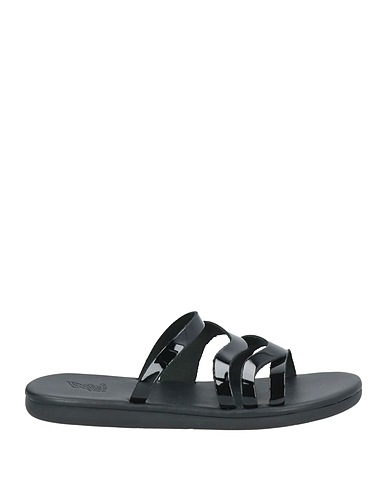 sandals, patent leather, solid color, no appliqués, leather lining, round toe, flat, rubber cleated sole, contains non-textile parts of animal origin