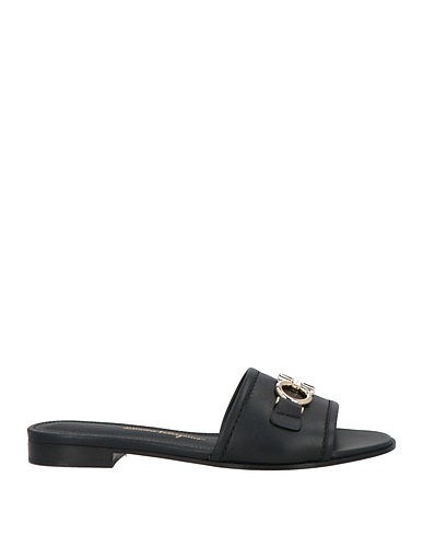 slide sandals, leather, solid color with appliqués, brand logo, embellished, leather lining, round toe, flat, leather/rubber sole, contains non-textile parts of animal origin