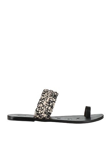 toe strap sandals, leather, raffia, two-tone, no appliqués, leather lining, round toe, flat, rubber sole, contains non-textile parts of animal origin