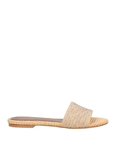 slide sandals, raffia, solid color with appliqués, crystals, leather lining, round toe, flat, leather sole, contains non-textile parts of animal origin
