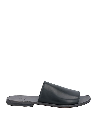 slide sandals, leather, solid color, no appliqués, leather lining, round toe, flat, leather/rubber sole, contains non-textile parts of animal origin
