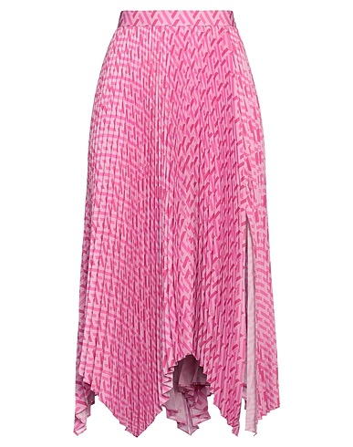 crepe, folds, logo design, mid rise, regular fit, unlined, zipper closure, side slit, asymmetrical hemline, no pockets, pleated style