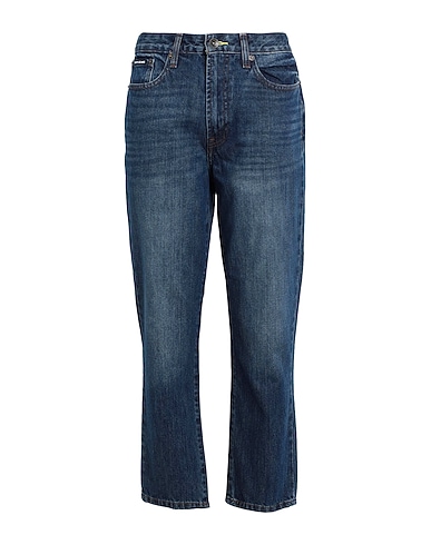 denim, faded, brand logo, solid color, dark wash, high waisted, belt loops, zipper closure, five pockets, mom-cut model