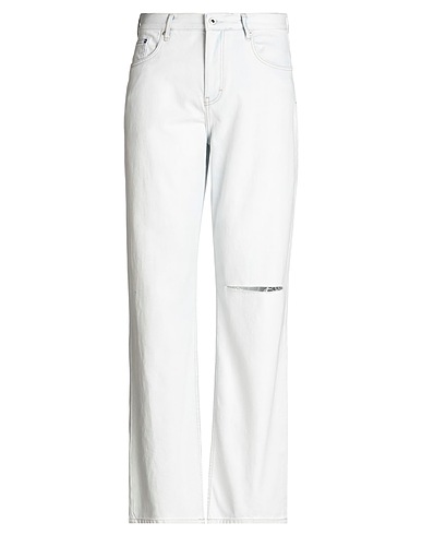 straight-leg jeans, denim, distressed, solid color, brand logo, light wash, high waisted, zipper fastening, 1 button, five pockets