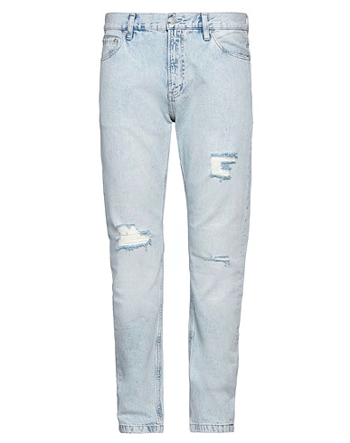 denim, distressed, faded, brand logo, solid color, light wash, high waisted, belt loops, tapered leg, slim-leg pants, button fastenings, zipper fastening, five pockets, skinny model