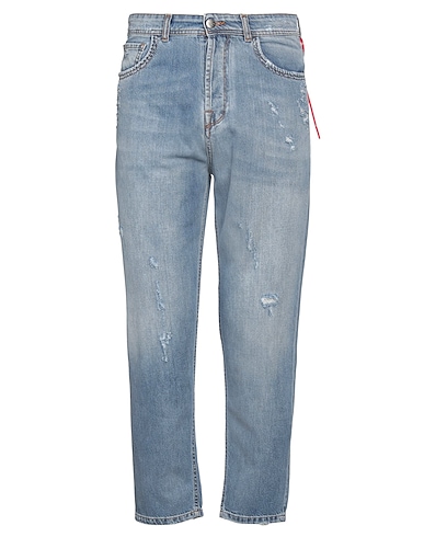 tapered jeans, denim, distressed, faded, solid color, brand logo, metal applications, medium wash, low-crotch, regular fit, button fastenings, five pockets