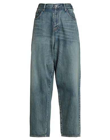 baggy jeans, denim, faded, solid color, brand logo, medium wash, high waisted, regular fit, zipper fastening, 1 button, pockets, hand wash or dry clean, do not bleach, do not tumble dry