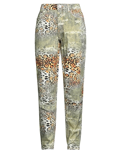 tapered jeans, denim, faded, leopard-print, leather trims, brand logo, colored wash, mid rise, regular fit, zipper fastening, 1 button, multipockets, machine wash, do not bleach, do not tumble dry, contains non-textile parts of animal origin