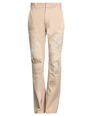 casual pants, gabardine, distressed, faded, solid color, brand logo, high waisted, belt loops, flared leg, regular fit, hook fastenings, zipper fastening, multipockets, dry clean