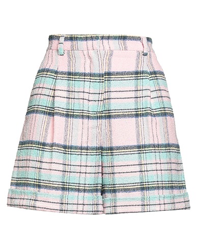 shorts, bouclé, tartan pattern, darts, high waisted, zipper fastening, hook fastenings, slit pockets, hand wash or dry clean, do not bleach, do not tumble dry