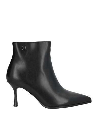 ankle boots, coated fabric, solid color, brand logo, fully lined, zipper fastening, pointed toe, spool heel, rubber cleated sole