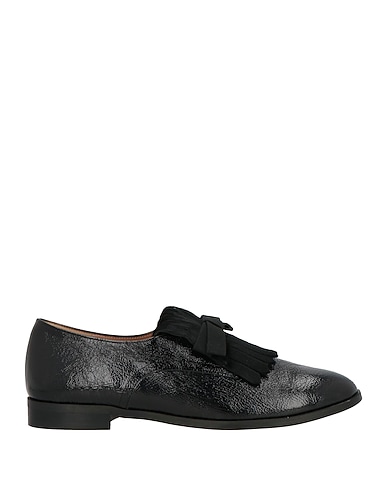 loafers, patent leather, solid color with appliqués, fringes, bow-detailed, leather lining, round toe, flat, rubber sole, contains non-textile parts of animal origin
