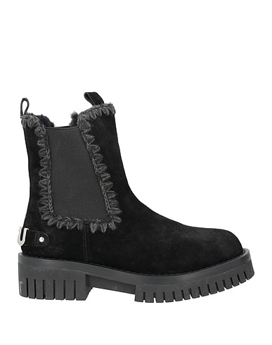 chelsea boots, suede, solid color with appliqués, brand logo, lined in shearling, elasticized inserts, round toe, square heel, rubber cleated sole, contains non-textile parts of animal origin
