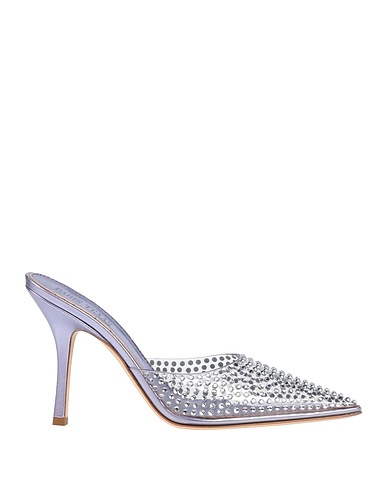 mules, plastic, coated fabric, solid color with appliqués, crystals, unlined, pointed toe, spike heel, covered heel, rubber sole