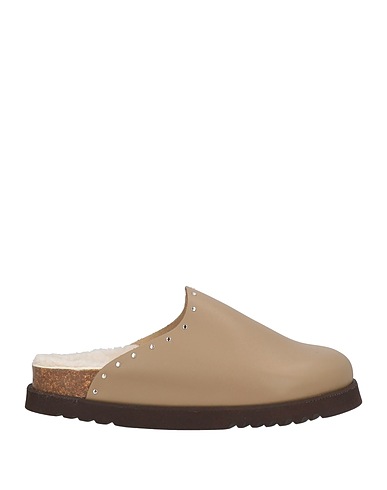 mules, leather, solid color with appliqués, studs, plush fabric inner, round toe, flat, rubber sole, contains non-textile parts of animal origin