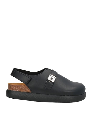clogs, leather, solid color, brand logo, velcro fastening, round toe, flat, rubber cleated sole, leather lining, contains non-textile parts of animal origin