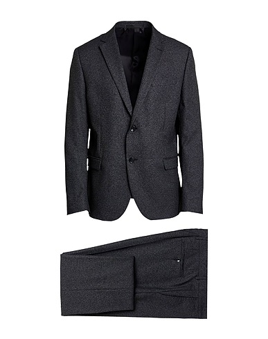 single-breasted suit, crepe, solid color, no appliqués, lapel collar, long sleeves, buttoned cuffs, fully lined, zipper fastening, flap pockets, one chest pocket, dual back vents, mid rise, belt loops, stretch, dry clean, do not bleach, do not tumble dry