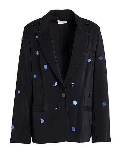single-breasted blazer, crepe, stretchy fabric, solid color with appliqués, sequins, lapel collar, long sleeves, shoulder pads, fully lined, button fastenings, welt pocket, one chest pocket, dry clean, do not bleach, do not tumble dry, amp up the glamour with chic designer party outfits for your next event or fun night out
